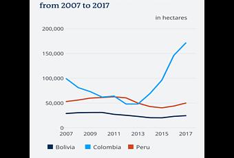 Colombia bajo el gobierno de Duque ha aumentado la producción de cocaína a 1900 toneladas anuales (2017) según los reportes de las Naciones Unidas. El mercado estadounidense y este europeo continúan consumiendo grandes cantidades del mayor contribuyente al PIB colombiano, la cocaína. El incremento de las áreas de producción es masivo en comparación con Bolivia y Perú, como lo reporto la oficina contra el crimen y las drogas de las Naciones Unidas (2019).