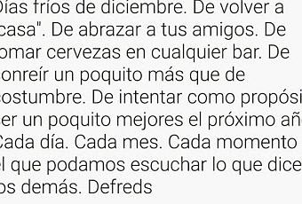 Un libro de Defreds. Será uno de los regalos de Navidad, ya en camino. Leyendo este fragmento, hago el mío:Días fríos de diciembre.Se desploman los termómetros, bufanda y manta.Reencuentros. Acurrucarme en ese abrazo.Paseos por la ciudad, bolas, árboles, colorido luminoso.Tom Waits, The Clash. Siempre con música.Tiempo con los amigos. Largas conversaciones, desayunos, aperitivos, comidas, cervezas, cafés, cenas. Tan a gusto.Sonrisas. Risas. Carcajadas.Añoranzas. Echar de menos, echar mucho de menos.Con ganas de ese nuevo calendario para la pared de la cocina.Turrones anticipados, saben mucho mejor.Árbol de Navidad, desde el trastero a la entrada de casa.Este año de nuevo en Vigo.Visita a correos. Paquetes que vuelan lejos.Un sueño hecho realidad. Letras impresas. Un punto de partida. Un gran impulso.Seguir disfrutando cada minuto con Vilma. Serenidad y felicidad.Novelas y poesía. Sumergirme en la lectura y olvidar.Llamadas de teléfono. Audios de whatsApp.Escuchar palabras, música, silencios, el sonido de las hojas bajo mis pies, las olas del mar. Villancicos, también villancicos.Mucho que agradecer.Deseos.Momentos especiales y recuerdos inolvidables.Dejar atrás miedos, desconfianza y distancia.Mirar hacia arriba, tejados, copas de los árboles y esa inmensa luna.Soñar despierta y dormida.Diferente.Chocolate con churros. Un buen plato de lentejas. Olor de café.Cine de estreno, clásicos y curiosidades.Cantar y bailar.Brindar, volver a brindar.2018. Planes en la cabeza, en la agenda.Poesía