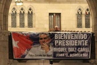 íCuba sí, bloqueo no!, fue un grito que retumbó varias veces al interior de la iglesia Riverside, la misma edificación que en el año 2000 acogió al líder histórico de la Revolución cubana, Fidel Castro, y en la Díaz-Canel estuvo acompañado por su par de Venezuela, Nicolás Maduro.