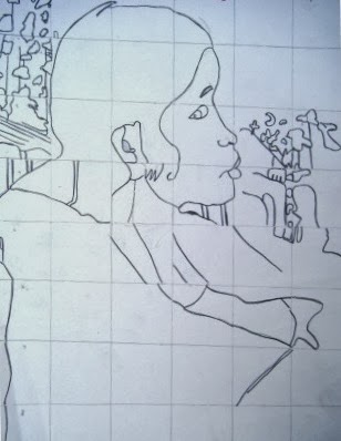 En una fotocopia de la imagen en blanco y negro se traza la cuadrícula, es muy útil numerar los cuadrados, para ir ubicando las líneas del dibujo.Segunda