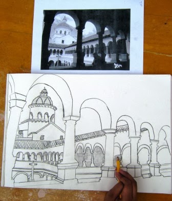 Se sombrea a lápiz. La fotocopia permite la observación de los valores del claroscuro (negros, grises y luces).