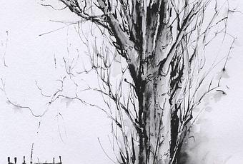 Una forma tradicional de dibujo es la que emplea tres colores: carboncillo, sanguina y blanco. Sobre un fondo a menudo coloreado, con esos tres colores se consiguen unos resultados asombrosos, especialmente en las carnaciones. Con las tintas, por ahora en papel blanco, voy intentando con mis árboles mezclar un marrón cálido y el negro. Dos plumas estilográficas y un pincel de agua. Hay que actuar rápido y medir muy bien la tinta que vamos dejando en el papel al dibujar, pues es un aspecto esencial. El momento en que se diluye parte del dibujo también es crítico. Si nos esperamos más, varía la respuesta de la tinta, que manchará menos que si se diluye recién aplicada. También ha habido que probar con distintas marcas de tinta, pues cada una responde de una forma al agua. Especialmente, hay negros que pueden emborronar todo el trabajo previo o que, diluidos, añaden un tinte morado o rojizo indeseado. En los dos árboles siguientes se muestran los resultados de estas pruebas, al menos por dónde vamos ahora. Hay que experimentar más.