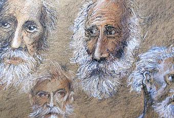 Lápiz carbón, sanguina, sepia y blanco sobre el consabido papel marrón.