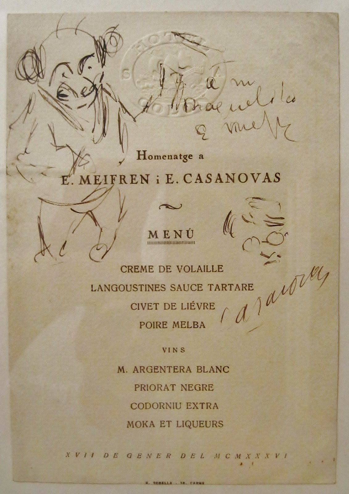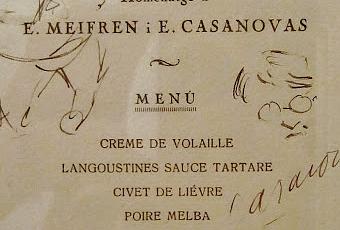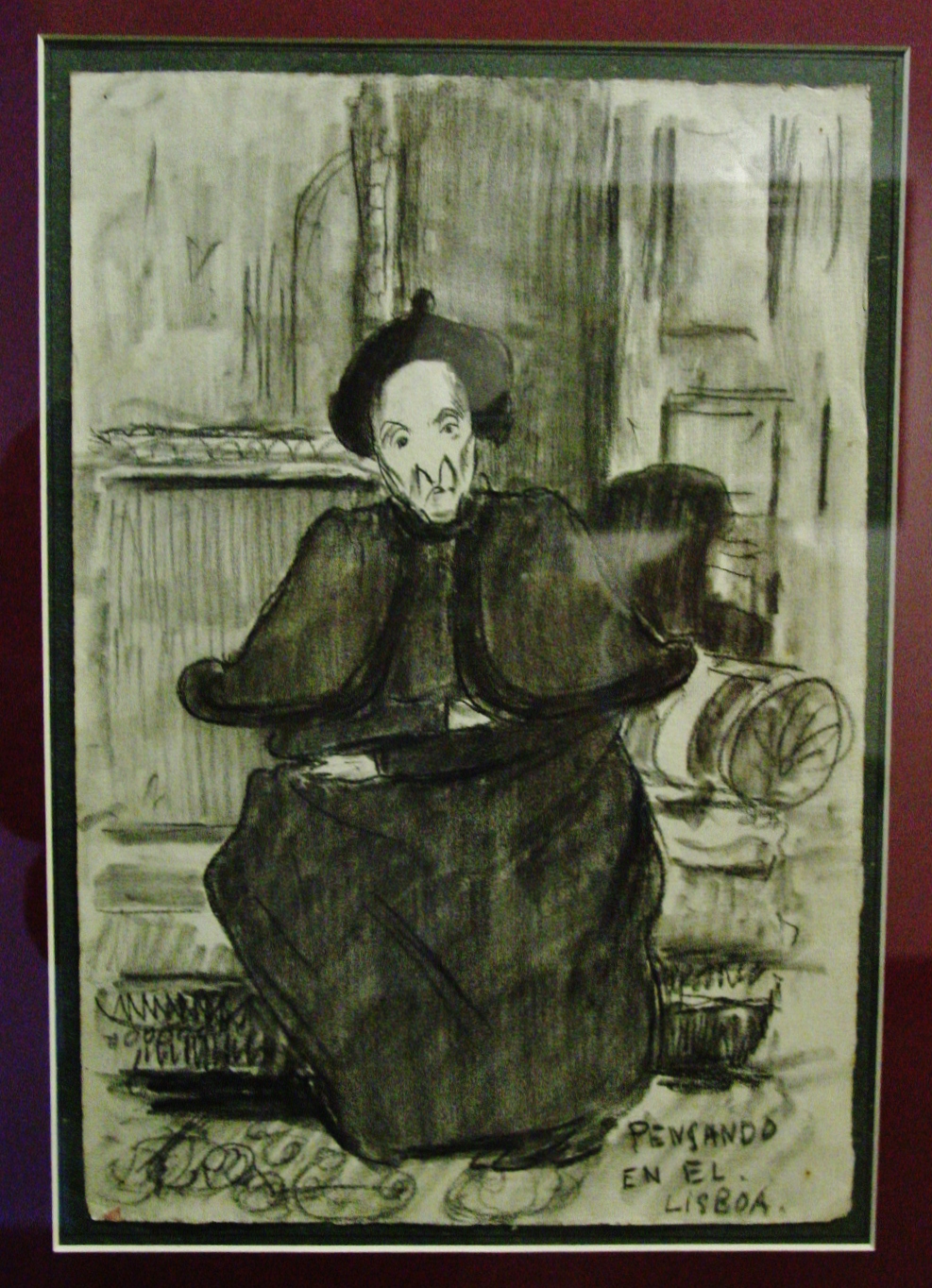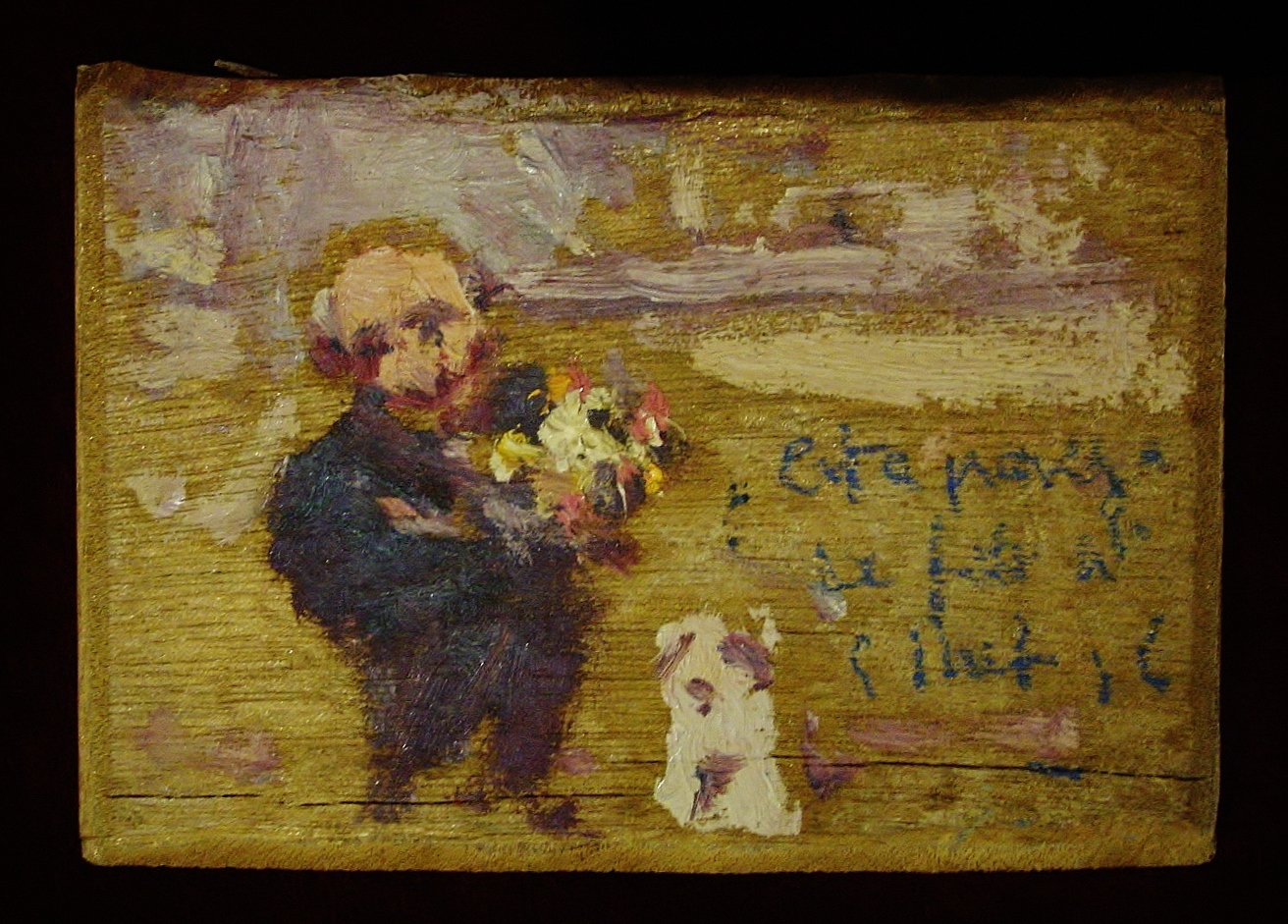 Respecto a la tercera imagen, una anciana sentada en un sofá, semblante triste. Quizá esperando noticias de algún allegado. El título del dibujo "Pensando en él. Lisboa" nos transporta a la capital portuguesa, donde la dama, de brazos cruzados, nos transmite, a través de su mirada al infinito, su desazón. Por otra parte, no nos hemos resistido a la tentación de incluir el reverso de un pequeño óleo sobre tabla. En esta pintura, Eliseo Meifrén dedica la misma, autoretratándose con un ramo de flores junto a un pequeño perro. Con sentido del humor la titula "Esta pareja de feos" firmando a continuación. Debería ser un regalo a un familiar o amigo, y, por cierto, hemos llegado a conocer el nombre de este can, se llamaba Betty. Nos hace una especial ilusión que la ampliación del artículo anterior a corrido más a cuenta de los lectores que nos han aportado estas interesantes imágenes. Nuestro único esfuerzo ha sido poder comentarlas brevemente. Todas ellas pasarán a formar parte del catálogo razonado sobre el artista. Volvemos a animar a todo aquel que tenga obra del Meifrén y quiera compartirla a través de este foro, que nos envíe imágenes de la misma.