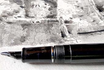 Con esa misma tinta Platinum, indeleble, se hace el dibujo inicial que se colorea con acuarela cuando la tinta está seca. La estilográfica es una Namiki Falcon extrafina Flex, de Pilot Una joya.