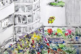 Dibujamos lo que vemos desde el balcón, las flores del alféizar, sobre todo unos pensamientos que están durando mucho más que nunca, algunos cactus que hace más de un mes empezaron a florecer, antes de que nevara sobre ellos en marzo y abril. La orquídea que acababa de perder la última flor, que aún está en la tierra de la maceta, ha retallinado y tiene dos brotes que han salido de una de las ramas que no se había secado. Las plantas también andan desorientadas.