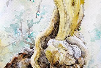 Entre las circunstancias que aconsejan salir menos, especialmente a encuentros de numerosa asistencia, y la necesidad de organizar biblioteca y materiales, poco hemos dibujado y pintado últimamente. A menudo pinto en casa, especialmente las acuarelas, más si son de formato medio o grande. Pero casi siempre a partir de fotos propias, de esas que se hacen en unas salidas y viajes tan poco frecuentes ahora. Echamos mano de archivo. Como en ese primer dibujo acuarelado apartir de una fotografía de un olivo del amigo Enric Serra Vilar.