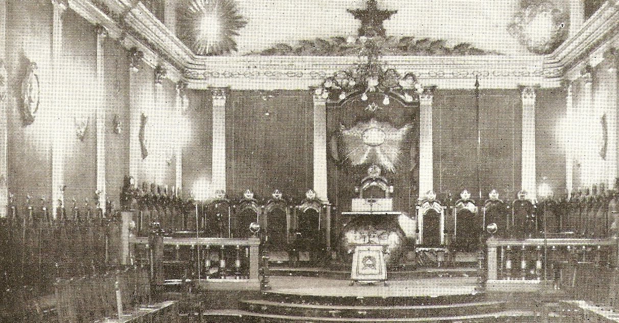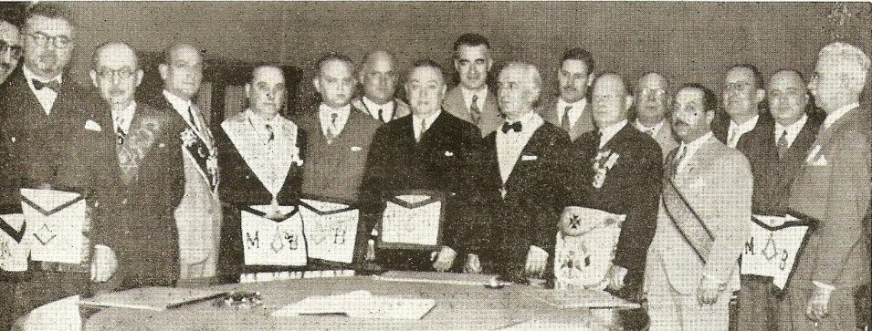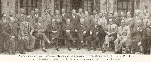 Autoridades de las Potencias Masónicas Uruguayas y Argentinas, con el IL.·. y P.·. H .·.Diego Martínez Barrio, en la sede del Supremo Consejo del Uruguay.