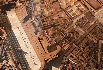 Maqueta de Roma en el siglo iv d. C., de Paul Bigot. El circo se encuentra entre el Aventino (izquierda) y el Palatino (derecha); la estructura ovalada a la derecha es el Coliseo.Diferencia social entre ricos y pobres en el Circo Máximo.