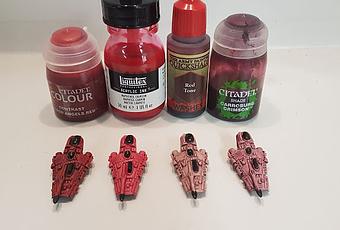 En el foro de Dakka Dakka y en FB Jonas Kristromse ha colgado dos fotos haciendo la comparación de efectos entre la pintura Contrast de Citadel (Blood Angels Red), la de Citadel estándar (Carroburg Crimson), el quickshade de The Army Painter y la tinta acrilica roja de la marca Liquitex.