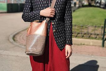 La camiseta y la chaqueta pintalabios son de La Condesa, pendientes Mèduse de Jawualy bolso cubo de Tándem.