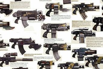 Lo que tenemos es una compilación en una sola imagen de diferentes modelos de bolters, pistola bolters y combi-bolters que salen en varios libros de Forge World, incluidos los de la Herejía de Horus (Y también de la Guerra de Badab).