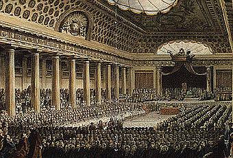 No obstante la visión clásica, el concepto izquierda-derecha recién nace en el Absolutismo Monárquico francés y de una forma muy diferente a la que lo conocemos ahora: durante las asambleas de los estados generales franceses (en la imagen), los nobles (que buscaban mantener las cosas como estaban) se sentaban a la derecha del rey, mientras que el pueblo (revolucionarios que promovían la lucha de clases mucho antes y con mejores motivos que Marx) se sentaba a la izquierda. Ya desde este momento podemos ver lo desfasada de la clasificación, pues los que luego (gracias al liberalismo económico de Smith) fueron a considerase derecha y a quienes ataco el Manifiesto Comunista, eran burgueses, nuevos ricos salidos del pueblo cuyos abuelos se sentaban a la izquierda del rey y que reemplazaron a los nobles en los círculos de poder.