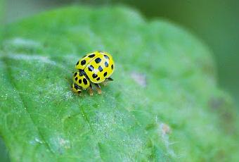 El primero de ellos es Thea 22-punctata. Es un coleóptero de la familia de las mariquitas (Coccinellidae). Se caracteriza por su pequeño tamaño (¡3-4 mm!), por su color amarillo y por presentar , pues eso, 22 puntos negros como su nombre indica.