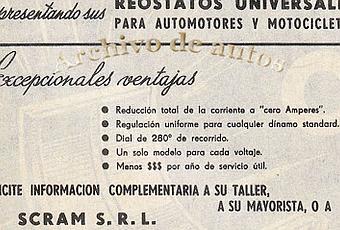 Mis conocimientos técnicos sobre electricidad del automóvil son muy básicos. Así que me tengo que atener a las especificaciones que se brindan en esta vieja publicidad. La empresa SCRAMfabricaba reóstatos universales para automóviles y motocicletas. El domicilio estaba ubicado en la calle 9 de Julio 55 de la ciudad de Rosario en la provincia de Santa Fe.