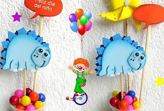 9.-Llenamos de dulces el vaso de plástico, pegamos nuestro dinosaurio sobre un palito o brocheta, puedes hacer cartelitos o molinillos para decorar el dulcero
