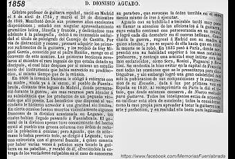 El 30 de Enero de 1858 se publica una biografía del célebre guitarrista Dionisio Aguado, como todos sabemos estuvo un buen tiempo viviendo en Fuenlabrada.Pues bien, podemos leer que la invasión francesa en 1808 le obligó a retirarse con su madre en una casita a Fuenlabrada (al final de la calle de las Navas esquina calle de Leganés). Sus beneficios a los vecinos le hicieron acreedor a una gratitud sin limites. Es decir, los fuenlabreños le conocían y le agradecían su presencia. Ya que si seguimos leyendo, nos dice que en alguna ocasión fueron muertos varios franceses acantonados de Leganés en nuestro pueblo (lo normal en aquella época, los españoles se defendían y querían la independencia de Francia). Esto hará que el general de la división envía a Fuenlabrada una gruesa columna con la orden de reducir la población a cenizas. Aguado en cuanto lo supo se dirigió a Leganés para entrevistarse con el general a quien conocía por tocar la guitarra en su pabellón, ofreciendo la entrega de los verdaderos culpables en el caso de conocerse el paradero y que revocase la orden terrible que iba a ejecutar. Al acabar la Guerra se dirige a Madrid donde morirá el 20 de Diciembre de 1849.