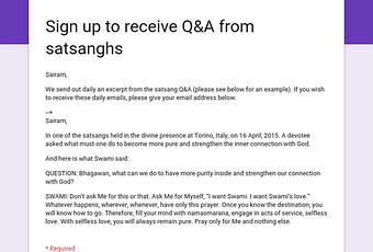 Sign up to receive Q&A from satsanghsgoo.glSairam, We send out daily an excerpt from the satsang Q&A (please see below for an example). If you wish to receive these daily emails, please give your email address below. --+ Sairam, In one of the satsangs held in the divine presence at Torino, Italy, on 16 April, 2015. A devotee asked what must one do to become more pure and strengthen the inner connection with God. And here is what Swami said: QUESTION: Bhagawan, what can we do to have more purity inside and strengthen our connection with God? SWAMI: Don't ask Me for this or that. Ask Me for Myself, "I want Swami. I want Swami's love." Whatever happens, wherever, whenever, have only this prayer. Once you know the destination, you will know how to go. Therefore, fill your mind with namasmarana, engage in acts of service, selfless love. With selfless love, you will always remain pure. Pray only for Me and nothing else.