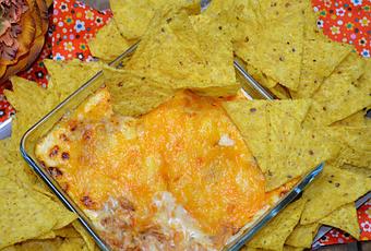 Para servir: puse una capa de salsa de queso, el pollo y otra capa de queso para gratinar por encima y al horno a gratinar hasta que esté dorado. Sacar y servir con nachos.