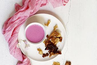 Ingredientes:- 40 g de remolacha cocida.- 170 g de queso cremoso de untar.- 1/2 cebolleta pequeña.- Chips vegetales de zanahoria, remolacha y chirivía de Tyrell´s.