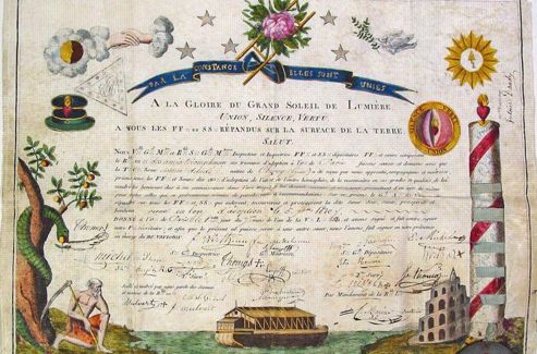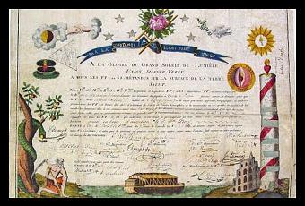 * Ilustración y texto: Derechos reservados © Musée de la Franc-MaçonnerieDiploma de adopción librado por la logia Los Amigos Triunfantes, Paris, a la hermana Victoire Daudé, 1820.