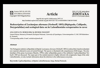 Abstract:The Portuguese endemic callipodidan millipede Lusitanipus alternans (Verhoeff, 1893) is redescribed, based on abundant new material collected in caves of central Portugal. The species is illustrated with comprehensive SEM images. The relationships of the genus Lusitanipus Mauriès, 1978 to other callipodidan genera of the subfamily Cyphocallipodinae Verhoeff, 1909 are discussed. The major part of the studied material is highly infected with ectoparasitic fungi of the order Laboulbeniales, we also include information about the infection in the subterranean ecosystem.