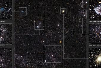 Espectacular imagen de una región de la Gran Nube de Magallanes conseguida con el instrumento WFI (Wide Field Imager, Cámara de gran campo) instalado en el telescopio de 2.2m MPG/ESO (Observatorio de la Silla, Chile). La toma disecciona la galaxia y deja ver claramente distintos objetos astronómicos presentes en el medio interestelar, destacando cúmulos estelares y nebulosas. Algunos de estos objetos se muestran y se identifican en detalle en los paneles a derecha e izquierda. La fotografía de prensa no incluye (al menos, yo no los veo) los detalles de las imágenes, pero supongo que se ha conseguido añadiendo muchas imágenes con largo tiempo de exposición obtenidas en los típicos filtros de ópticos de banda ancha B (azul), V (visible o verde), R (rojo) e I (infrarrojo), y haciendo un mosaico de la zona (varios apuntados). Crédito de la imagen: Observatorio Europeo Austral (ESO, European Southern Observatory).