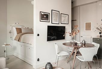 Lo mejor cuando llevas blogueando tanto tiempo, es que te encuentras con casas que ya has publicado antes y ves cómo ha evolucionado el interior. Este pequeño estudio escandinavo apareció en el blog hace 2 años, entonces la casa tenía un esquema de color diferente, la cocina era azul y el azul también era dominante en la decoración del estudio. Ahora el estudio sigue siendo igual de luminoso, pero la cocina se ha pintado de un hermoso tono verde y el esquema de color general es mucho más tranquilo con sutiles tonos nude combinados con un elegante diseño escandinavo. Inspírate!!!