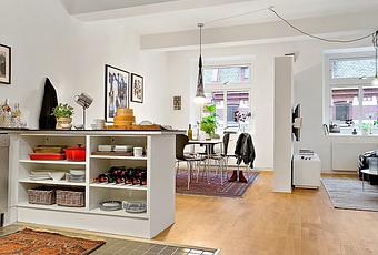 Como ejemplo veremos este fantástico apartamento de 67 m2 de estilo nórdico, donde se crean espacios con un flujo de tránsito semi-abierto, maximizando la sensación de amplitud pero manteniendo la intimidad y separación de los ambientes. Esto se logra gracias a la separación de las estancias con un tabique flotante que dividen el salón del comedor. Como puedes comprobar dicho tabique separador no tiene un cerramiento completo, no llega de pared a pared, ni de suelo a techo, logrando una dosis de intimidad pero sin llegar a romper la sensación de estancia única.