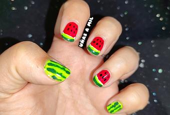 En las uñas verdes, lo que he hecho ha sido imitar la cáscara de la sandía con otro tono de verde y ha sido con el mismo pincel del esmalte haciendo líneas irregulares.
