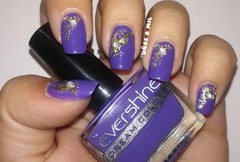 Este esmalte y estas pegatinas tienen ya muchos años y todavía siguen en buen estado así que decidí hacer una manicura sencilla en morado y dorado.