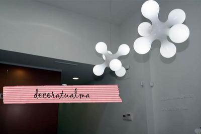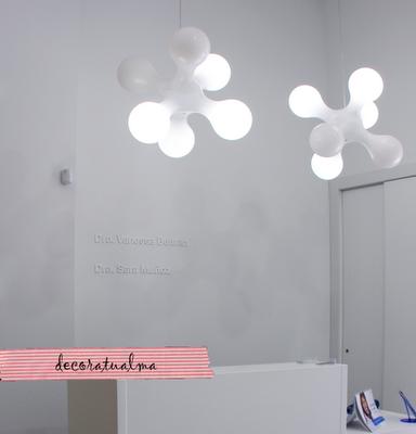Detalle de las lámparas Atomiumcolgando sobre el mostrador de recepción