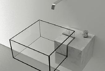 Mármol de carrara y vidrio conforman este geométrico y minimalista diseño de lavabo.