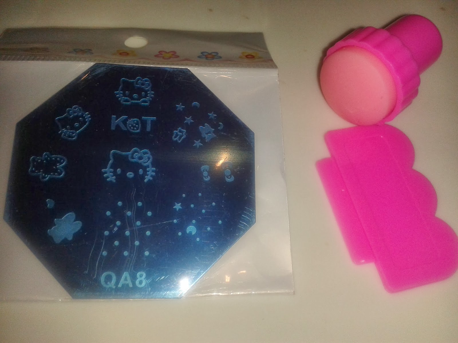 También tenía ganas de empezar a estampar dibujitos y motivos florales en las uñas, y en subasta conseguí ésta plaquita por 0,90. ¡No sabéis que manicuras de Hello Kitty más chulas me estoy haciendo!.