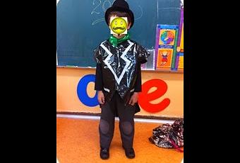 Se lo ponemos con una camiseta de manga larga negra. A la chistera se le pone una tira de la bolsa de basura verde, y también se le hace un pañuelo para el cuello con la bolsa verde, para que quede todo elegante. Con el pantalón gris del uniforme del cole y los zapatos, todo hecho.