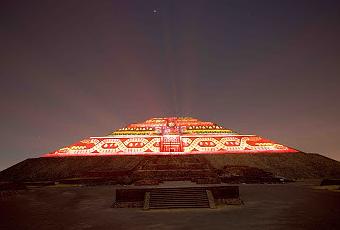 Posteriormente, los asistentes disfrutan del video mappingque se proyecta sobre la Pirámide del Sol y que habla de la cosmogonía de esta cultura, así como del trazo de la ciudad prehispánica de Teotihuacán.