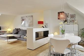 Original forma de separar visualmente el salón del comedor en este precioso ático danés, con un falso murete hecho con un mueble bajo(parece de hecho una chimenea de bioetanol), que aporta espacio extra de almacenaje/exposición. Mucho diseño danés además en esta vivienda, desde la mesa de comedor y las sillas de Fritz Hansen hasta las estanterías modulares colgadas de la pared de la marca Montana. Diseño original mezclado con piezas de Ikea, una tendencia cada vez más recurrente en el estilo nórdico actual. ¡Feliz jueves!