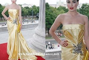 Dita Von Teese caminó radiante sobre la alfombra roja de la "Life Ball", en Viena, con un fabuloso vestido de Elia Saab, Primavera 2008, en tono amarillo pálido, escote palabra de honor, drapeado y con una bonita aplicación en plata en la parte delantera. Lo combinó con un bolsito de raso a juego. El vestido le sienta como un guante y Dita está espléndida. vía