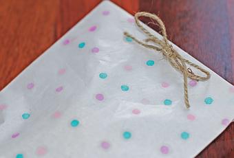 1. Impregna la goma con una de las tintas que hayas elegido y estampa la goma repetidas veces sobre la bolsa de papel. Impregna la goma tantas veces como sea necesario para que los círculos sean suficientemente nítidos.