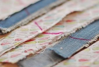 Fui rasgando lazos de tela vaquera, que decidí combinar con otros creados con tela de colores. Los pegué a uno de los palos de madera, por la mitad, uno a uno. Cuando tuve todos pegados, marque con un rotulador una forma de banderín y recorté los lazos. Y aquí está el resultado…