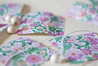 Cut paper squares and then make a hole in the middle with a jar needle. To make the garland you only need to insert the square in the cord, where you previously have tie the bead. Then just glue, hot glue gun both oposites sides with the cord and you are ready!