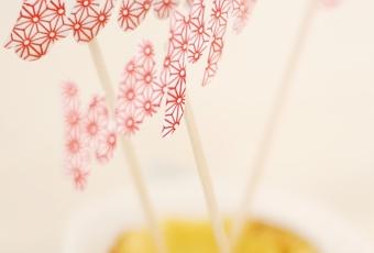 Por el lado no impreso, pega un washi tape o fabric tape estampado, procurando hacer coincidir los motivos. Con una tijera o un cutter recorta las palabras que vayas a utilizar para tu cake topper. Cuando hayas terminado solo tienes que pegarle unos palitos pequeños de brocheta y listo.