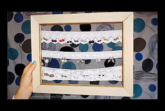 Para el segundo vamos a necesitar un marco y un tapete de croché, el mío lo hizo mi abuela y me recuerda a ella. Le damos la vuelta al marco y fijamos con chinchetas el tapete, que también debe de quedar tirante, como se ve en vídeo y ya hemos terminado el segundo organizador. Ahora sólo nos falta colocar los pendientes.