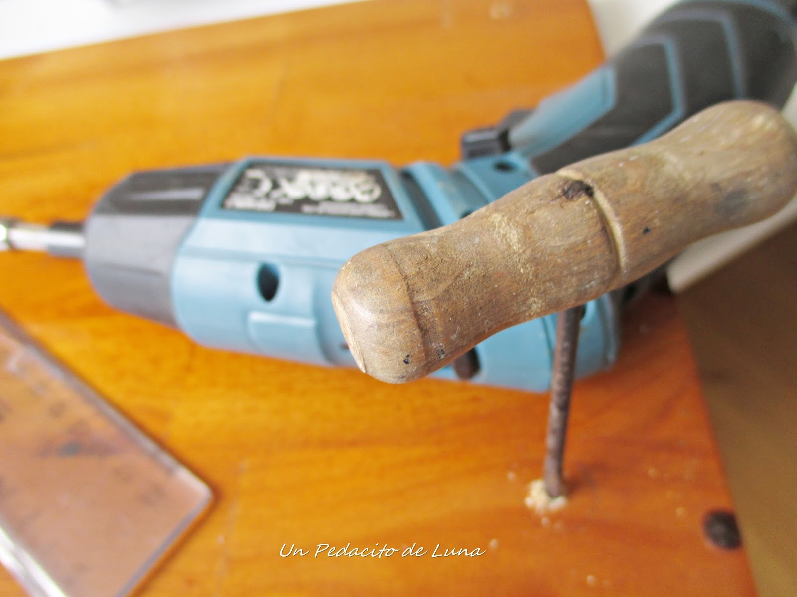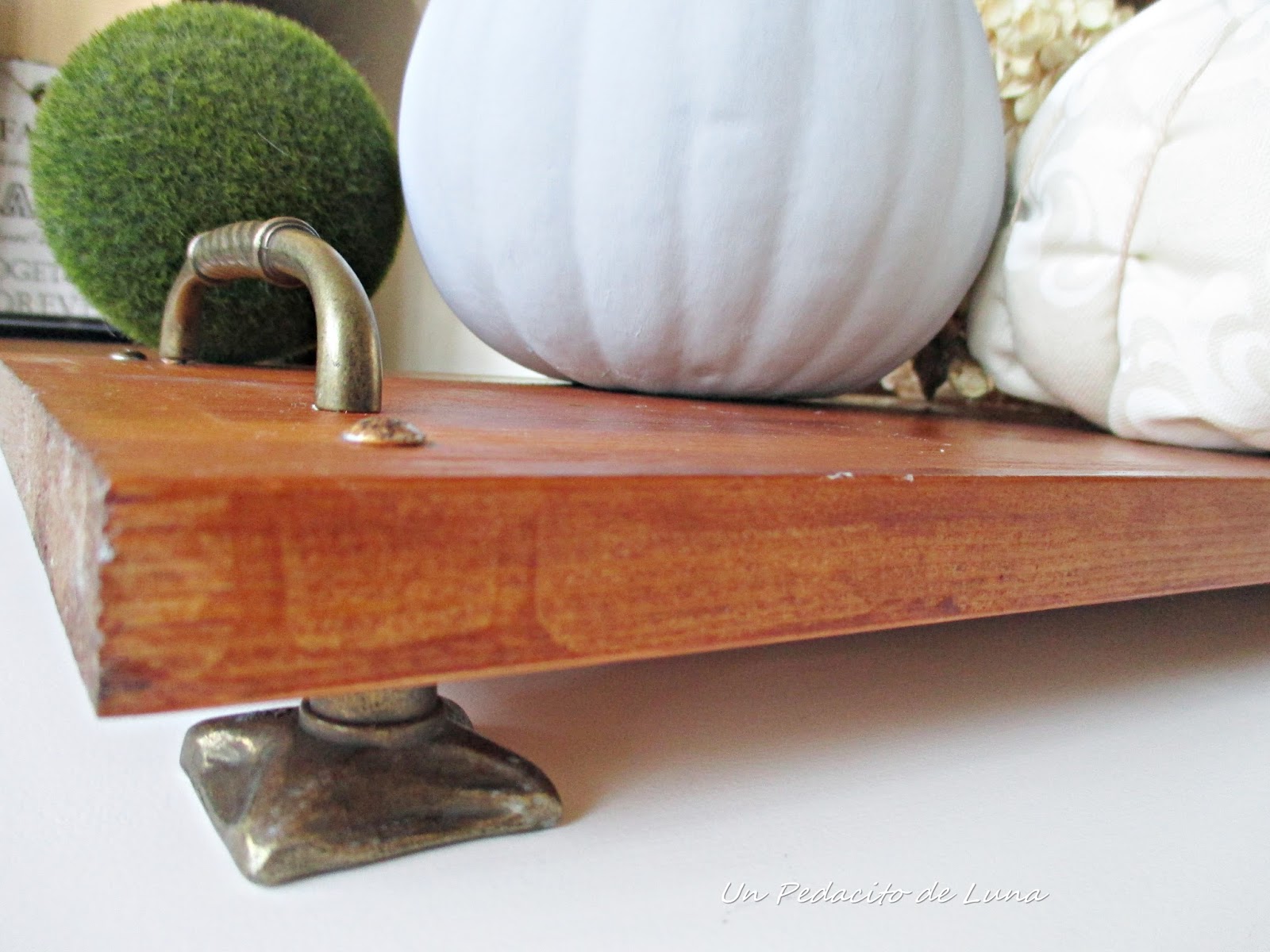El caso es que se me ocurrió que sería buena base para mi decoración otoñal y había que darle aún más importancia.Recordé una idea que había visto en internet, la elevé con unos tiradores de cajón y le puse otros a modo de asa, cual si fuese una bandeja.
