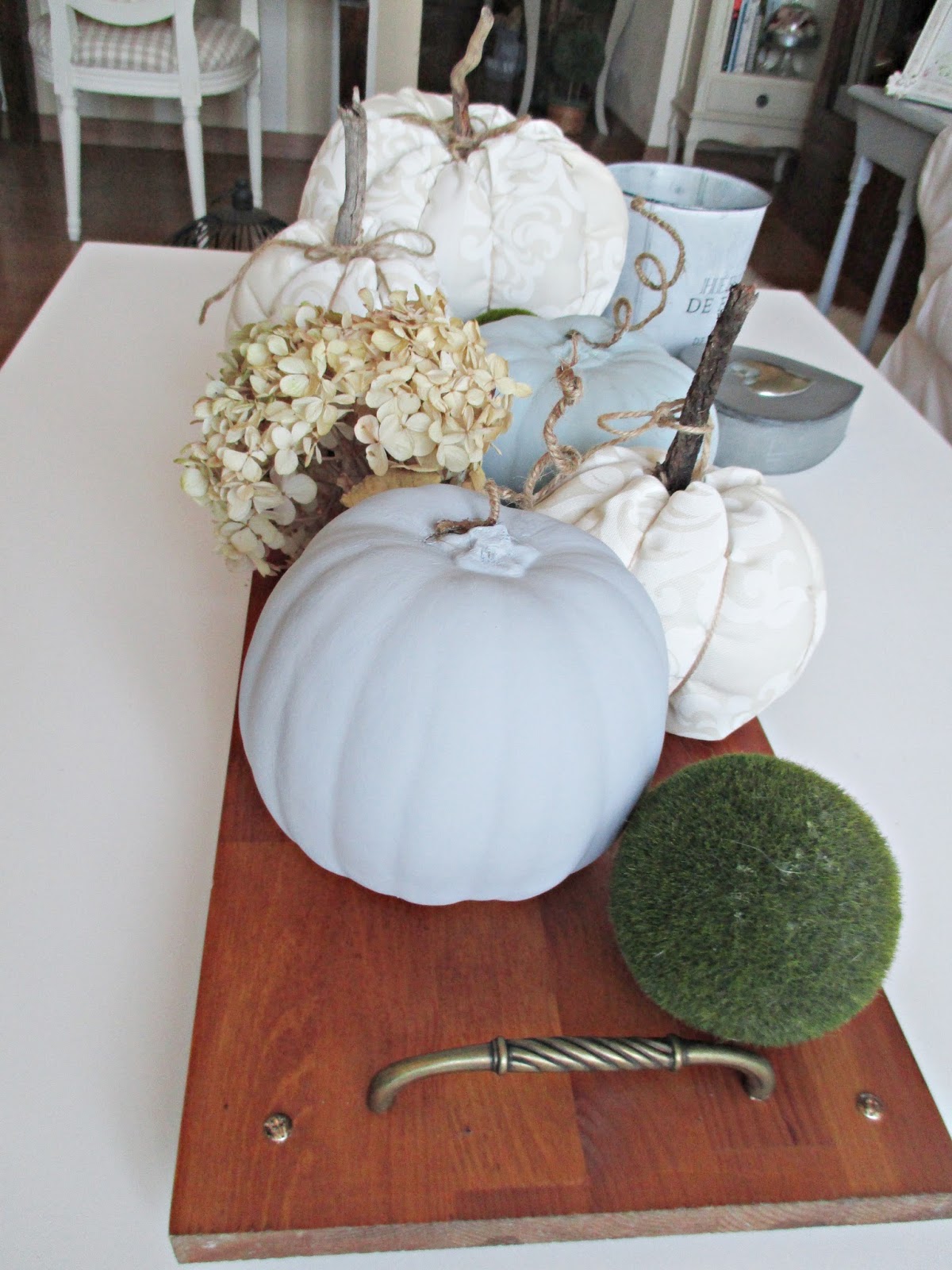 Las dos calabazas auténticas fueron pintadas con chalky vintage y antaño.Para decorarlas un poco más, y ya que tenían el rabito muy corto, les proporcioné uno con alambre forrado con cuerda.