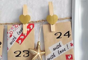 De esta manera, ya tenemos todos los sobres decorados y con sus correspondientes números, los he ido colocando en las cuerdas, sujetos con las pinzas y en algunas he pegado los corazones dorados. No me puede gustar más el resultado!!