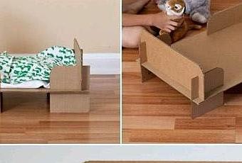 Copia la plantilla en el cartón, recórtala y monta la cama, con unos retales de tela fabrica las sábanas y los cojines. Y ya tenemos lista para jugar.