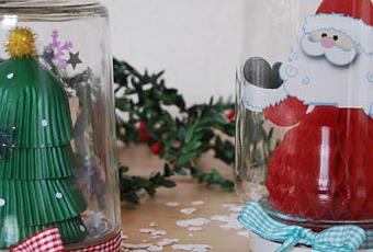 El segundo centro navideño que te propongo es tan fácil que no he fotografiado los pasos. Basta con que incluyas un puñado de confeti nieve, confeti blanco y confeti estrellas plateadas en el tarro. Después, fija un decorado Papá Noel Mini 3D a la tapa y cierra el tarro. El tarro no es tan espectacular como el árbol de cestitas pero es muy alegre y sencillo.