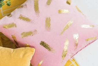 Empezamos eligiendo una funda de cojín del color que mas te guste. En esta ocasión el blog design love fest del que procede este tutorial ha escogido un rosa pastel, un tono en el que las pinceladas doradas resaltan especialmente.