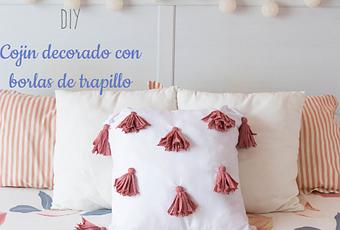 Materiales:- Cojín liso o relleno con funda blanca- Trapillo- Tijeras- Aguja e hiloElaboración:Lo primero que hay que hacer son las borlas con el trapillo del color que hayamos elegido, y tantas como queramos llenar el cojín.Si no sabes hacerlas, en este post te lo cuento ;)